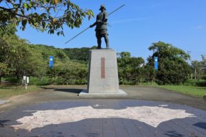 高知県中南部にある長宗我部元親像の目前には、当時の土佐の勢力図があります。